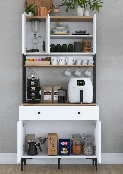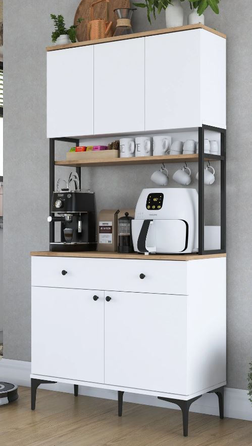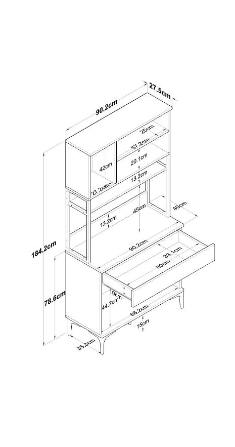 Toplam 184.2 cm yüksekliğe sahip olan ürün; üst bölümde kapaklı ve açık raf kombinasyonuyla pratik kullanım sunar. 90.2 cm geniş çalışma yüzeyi, ister mutfakta küçük ev aletleri için, ister çalışma odasında masaüstü kullanım için idealdir. Alt bölümdeki geniş çekmece ve yan dolap, büyük hacimli eşyalar için oldukça kullanışlıdır.