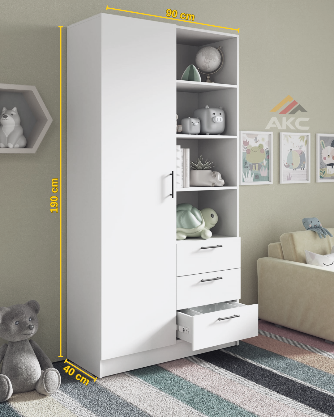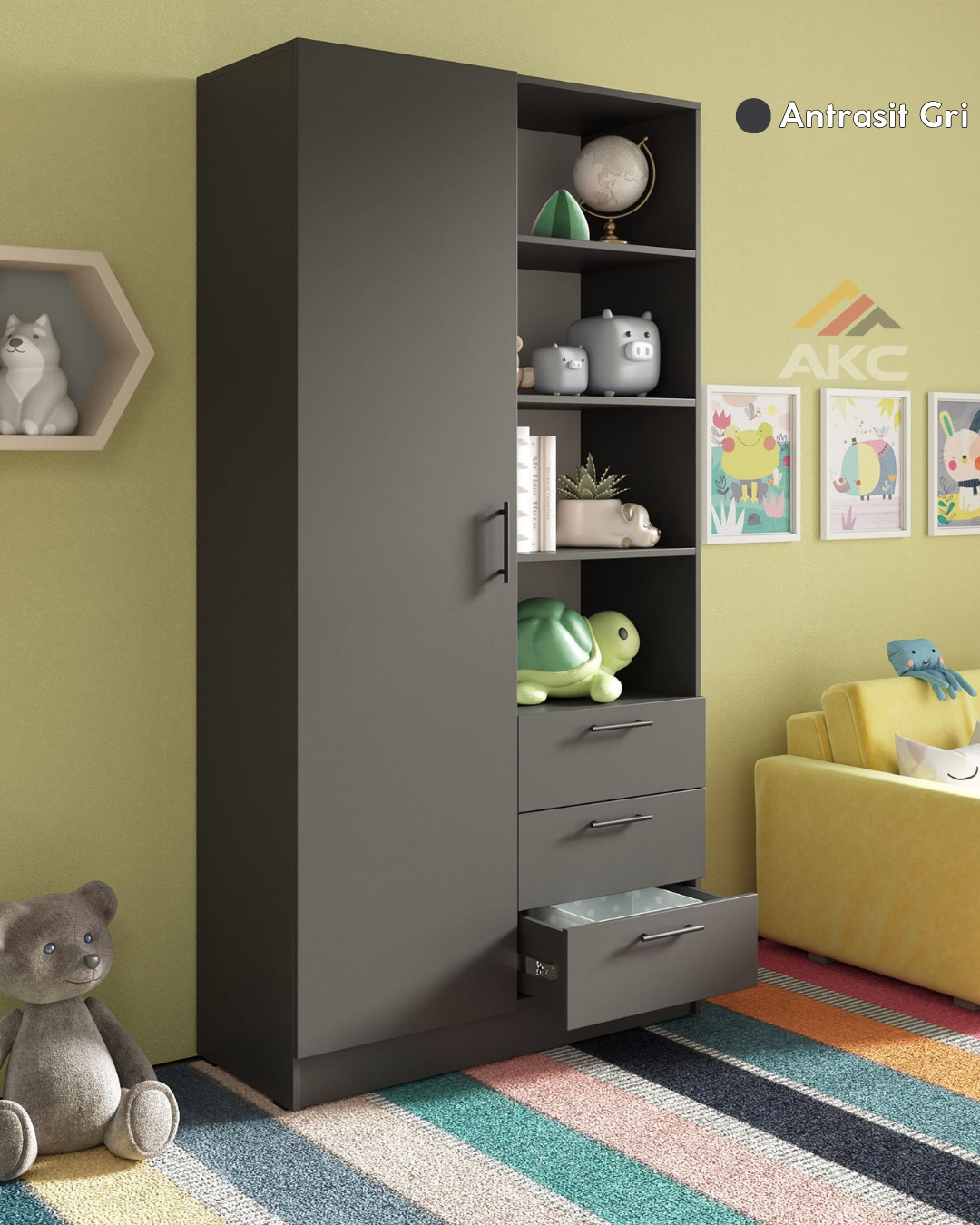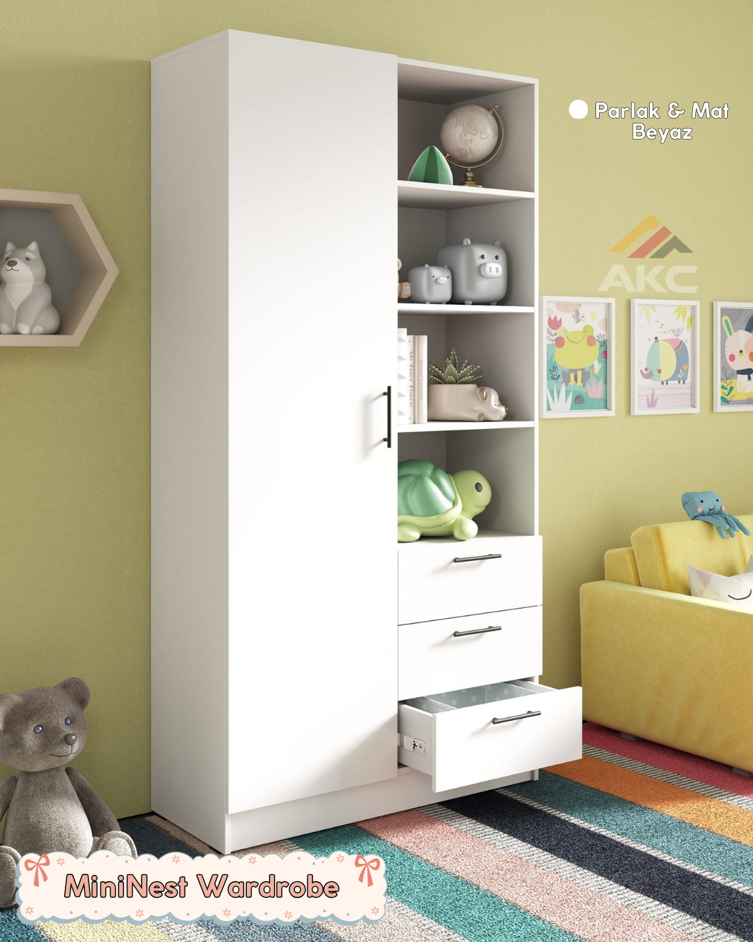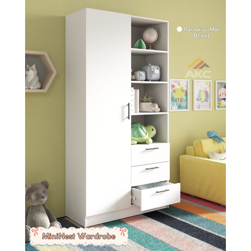 Geniş depolama alanı, çekmeceli yapısı ve modern tasarımıyla MiniNest Wardrobe, çocuk kıyafetlerini ve eşyalarını düzenli bir şekilde saklamanızı sağlar.