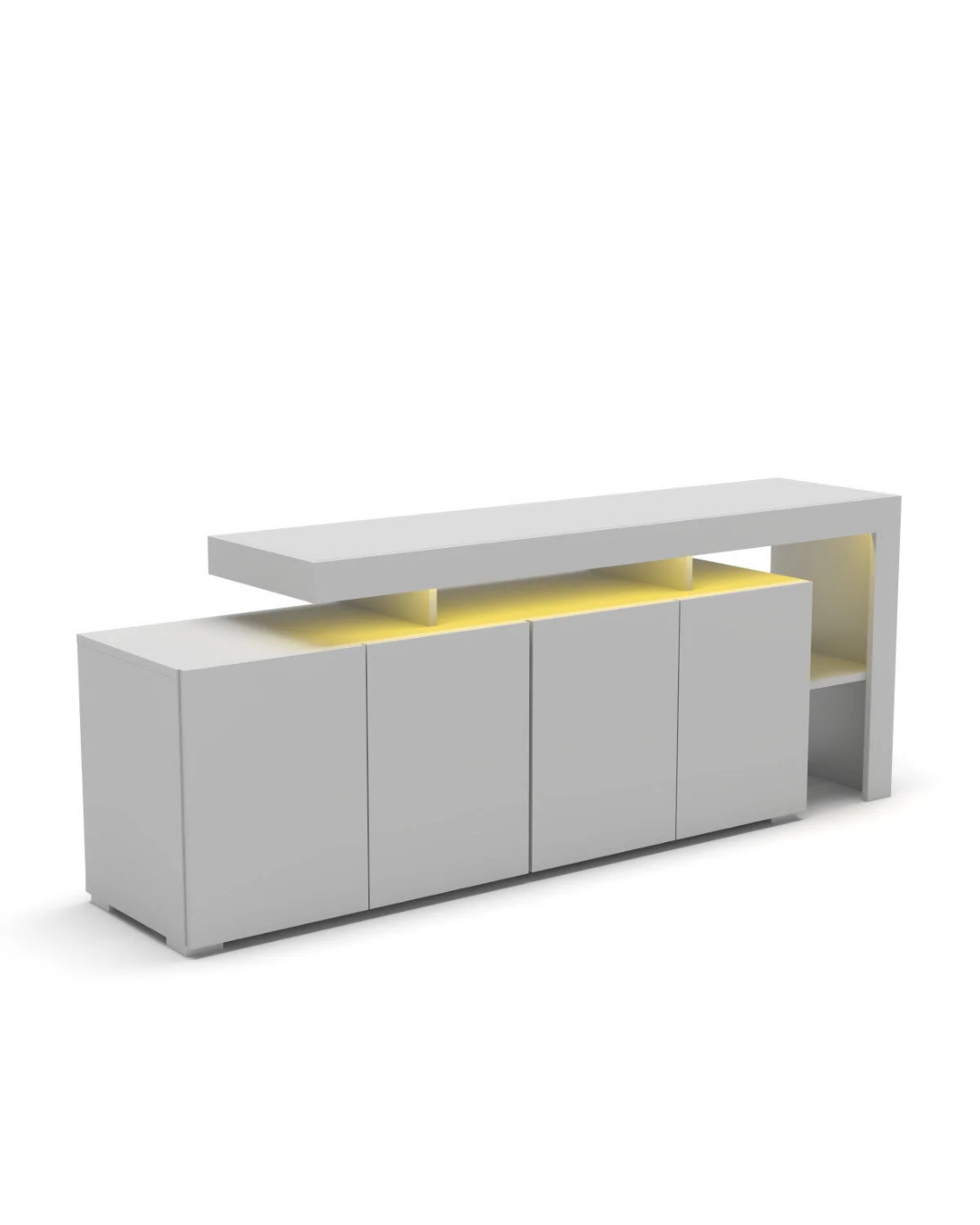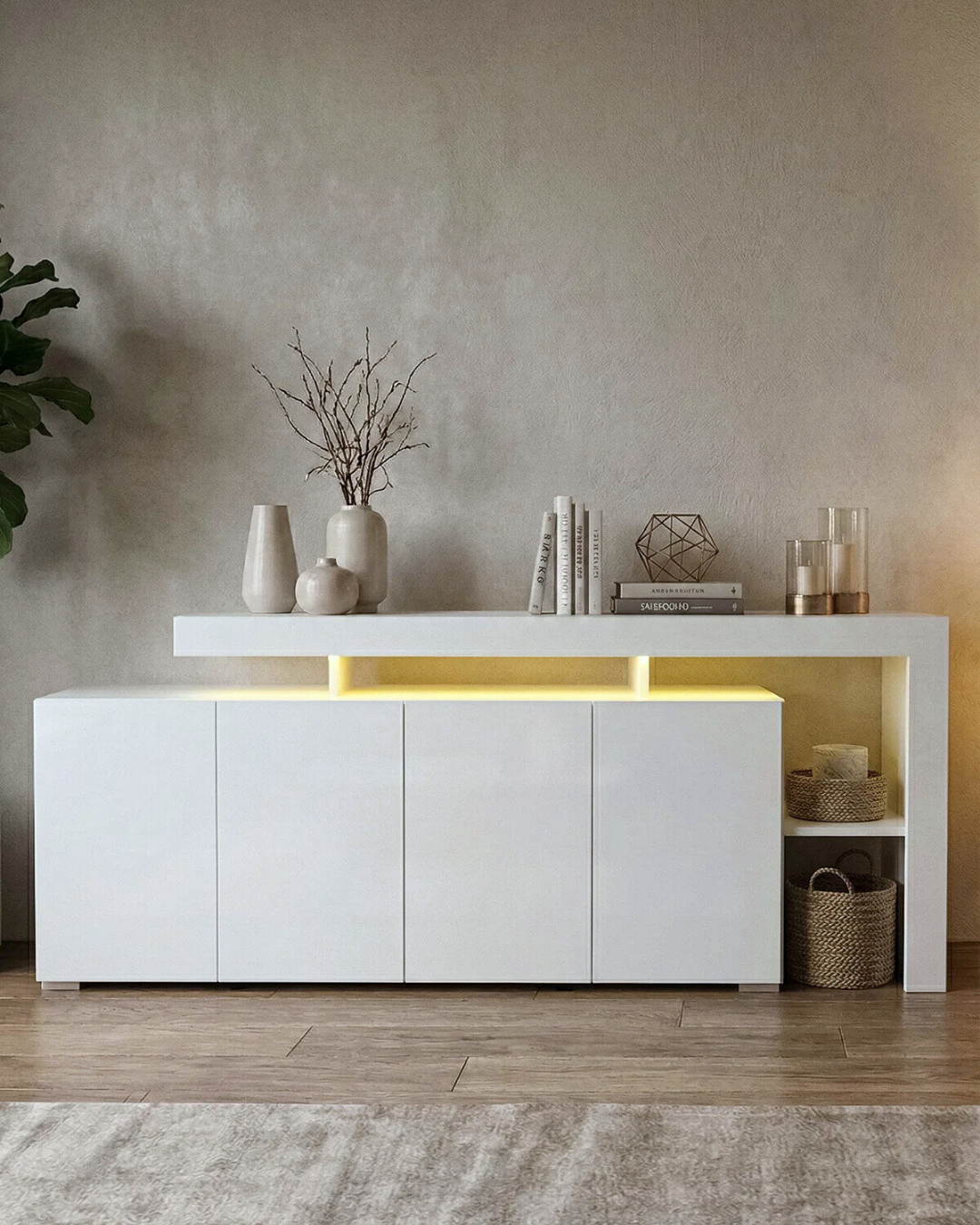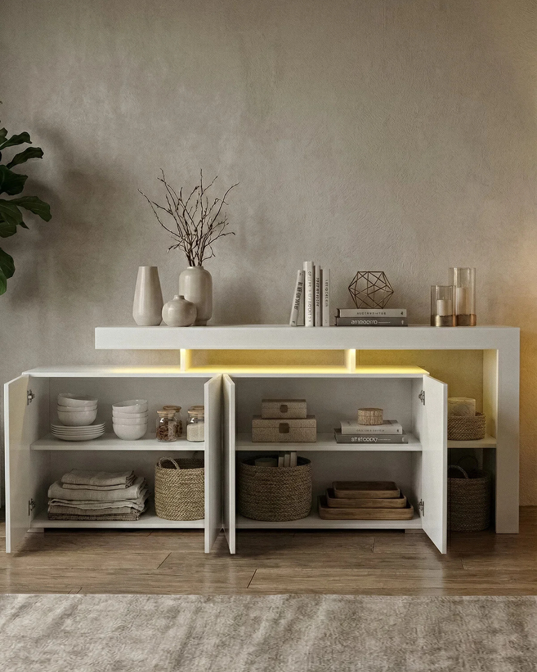 Entegre aydınlatma detayları, konsola derinlik kazandırırken ortama sıcak ve davetkâr bir atmosfer sunar. Kapalı depolama alanları sayesinde düzenli bir kullanım sağlarken, üst yüzeyi dekoratif objeler için ideal bir alan oluşturur.